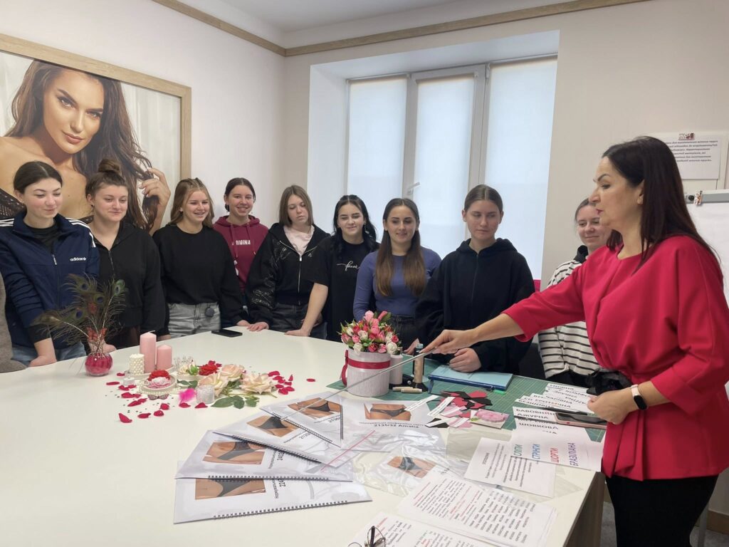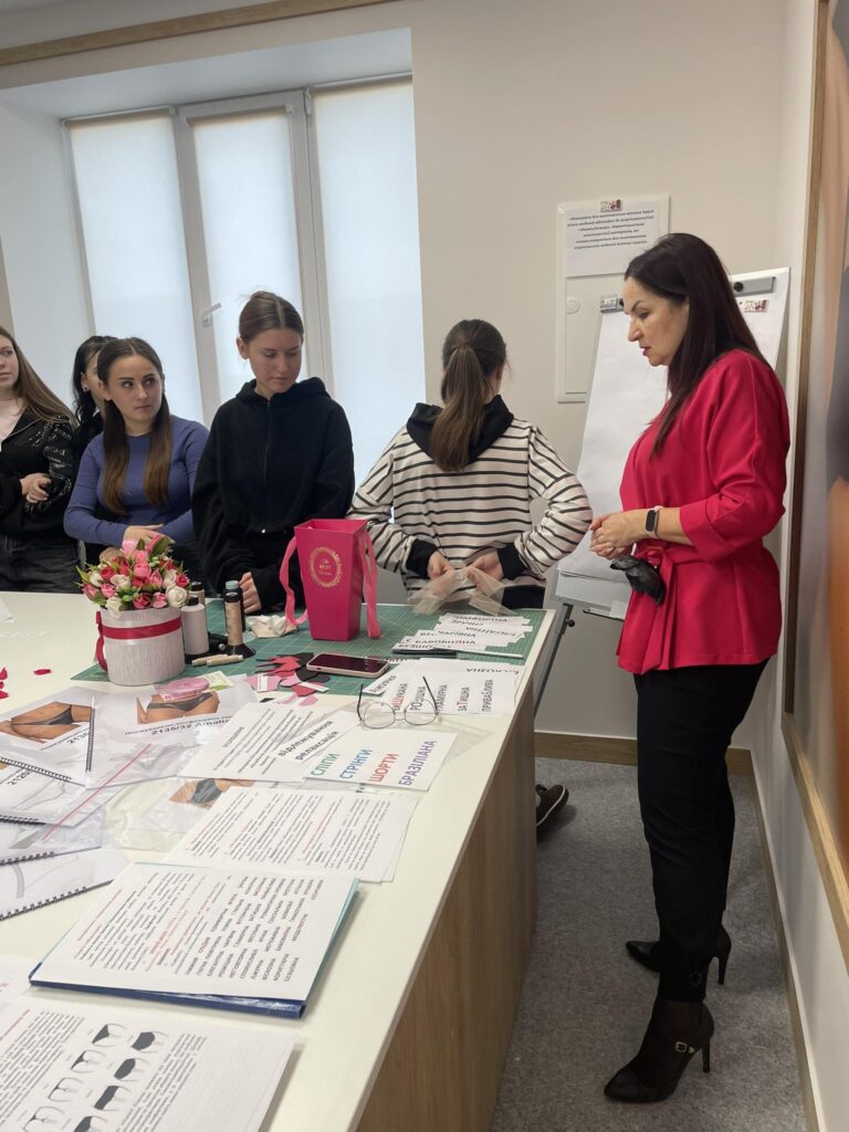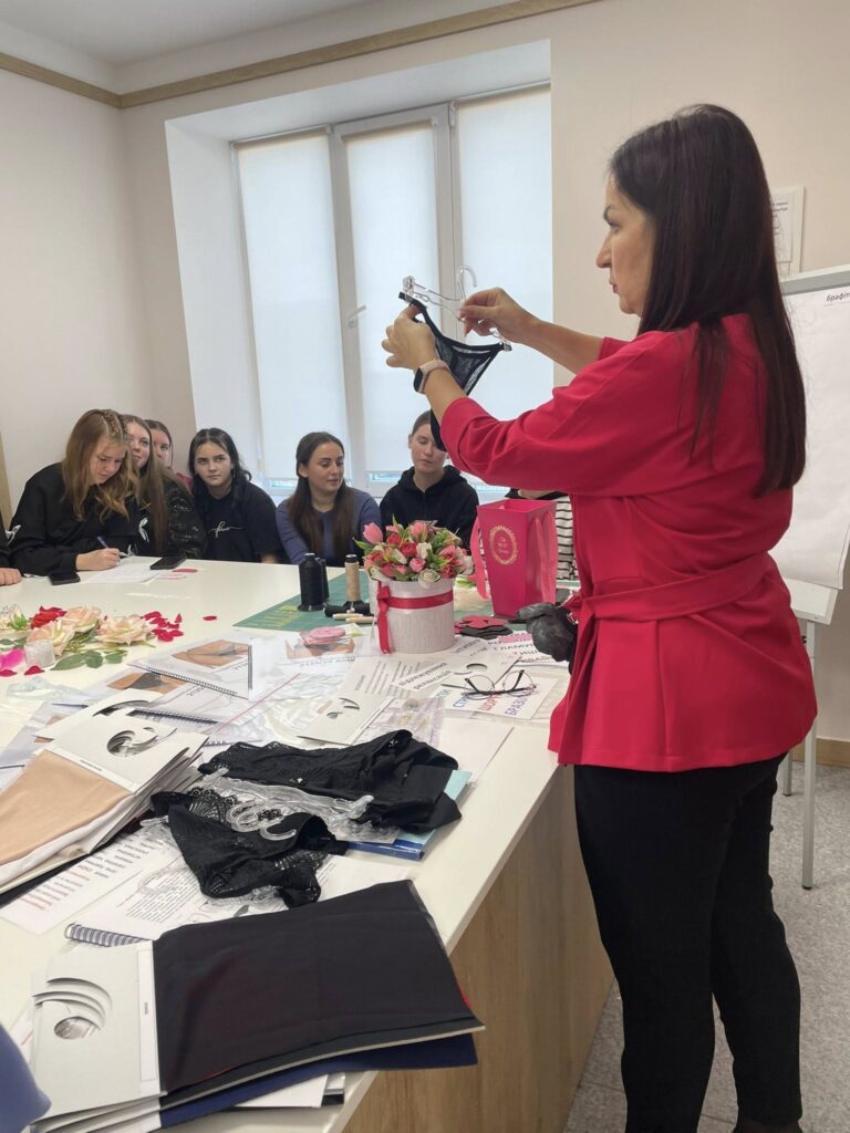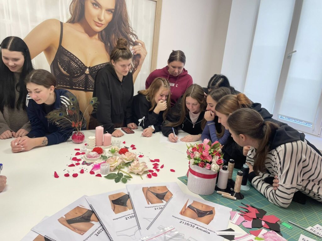 Викладач Інна Фесенко на базі Лабораторії з пошиття жіночої білизни провела захоплюючий показовий урок на тему: «Характеристика та властивості матеріалів, які використовуються для виготовлення асортименту моделей жіночої білизни. Використання бавовняних еластичних полотен та еластичного мережива відповідно до асортименту ТзОВ «Жасмін Лінжері».